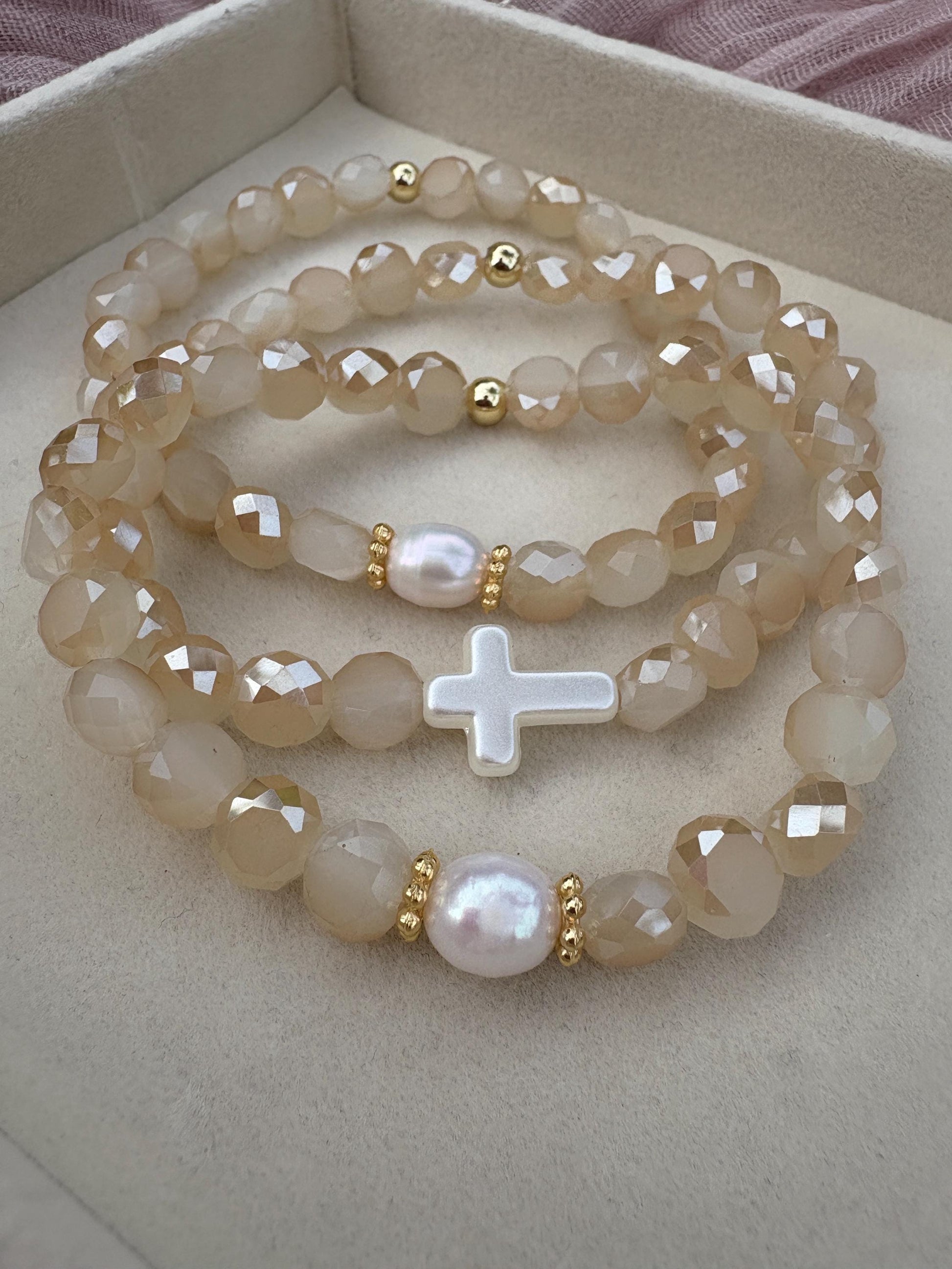 Champagne Faceted Beaded Stretch Bracelet Set of 3