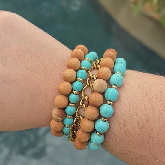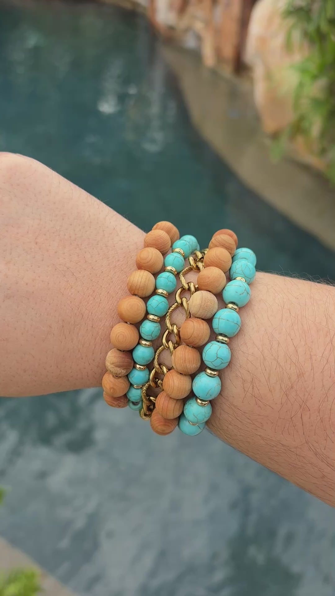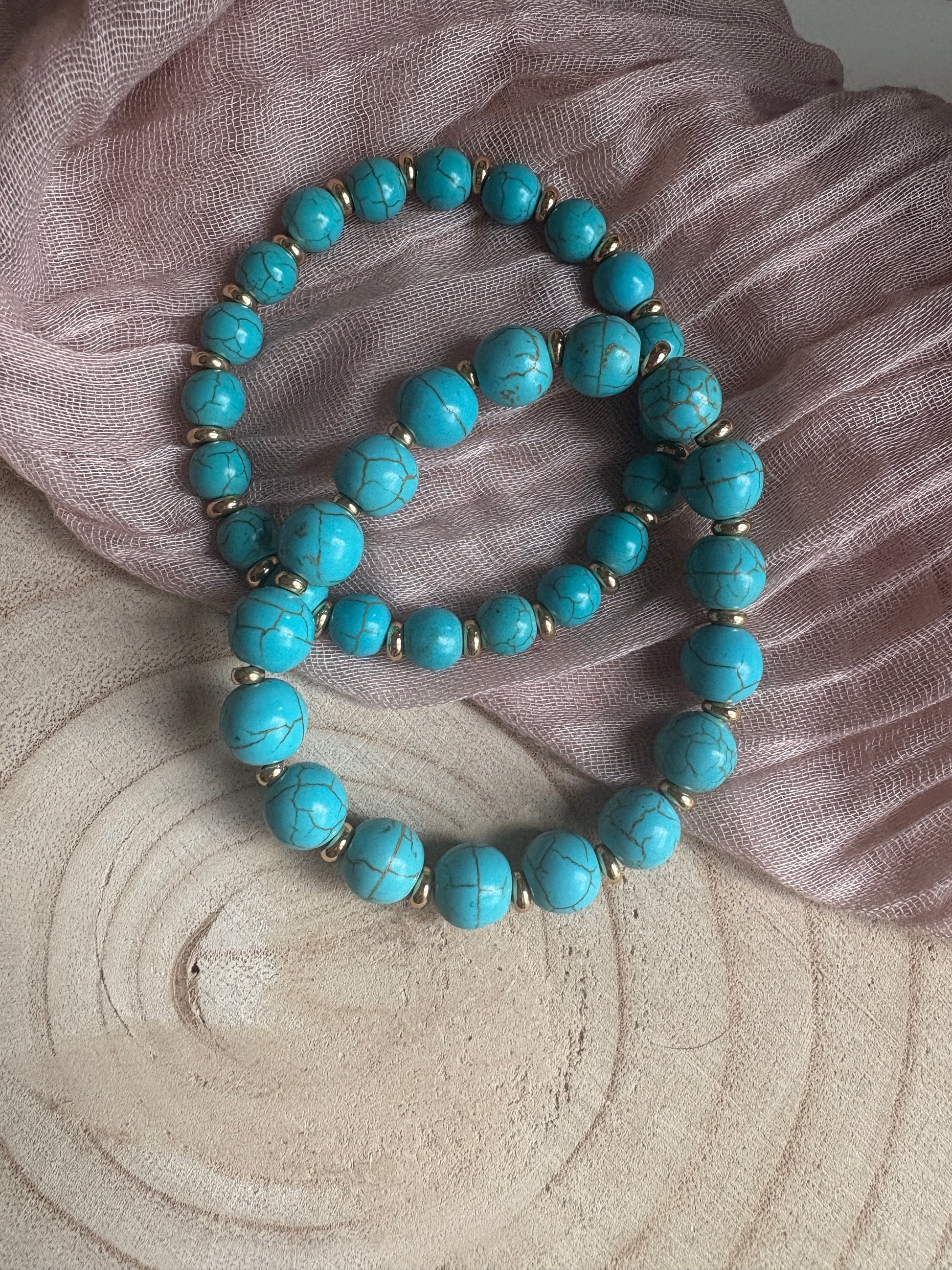 Inspired by a jeweler friend whose kindness and creativity continue to inspire me. This bracelet blends turquoise-colored Howlite with gold accents for a look that feels bright, calm, and timeless. Howlite is known for promoting patience and peace of mind, making it the perfect piece to wear when you want to carry a little calm through your day. Beautiful on its own or stacked with wood or neutral tones from the More than Beautiful collection for an effortless, coastal feel.