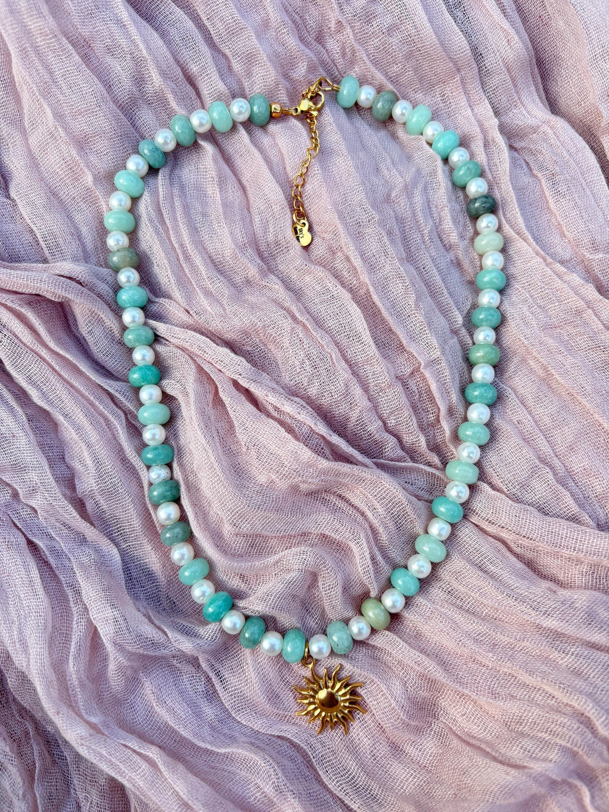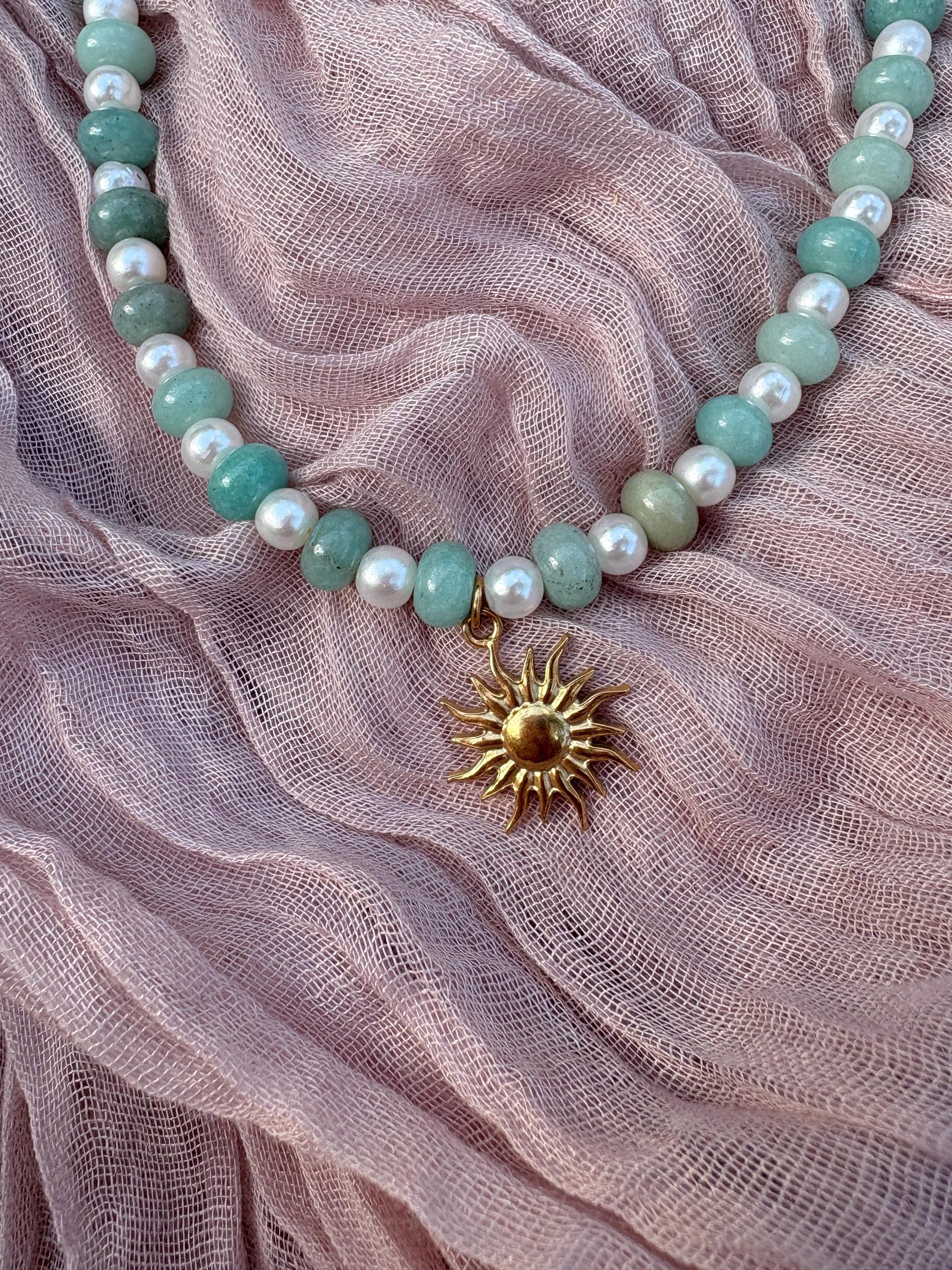 Green Agate Bead Necklace with Sun Charm