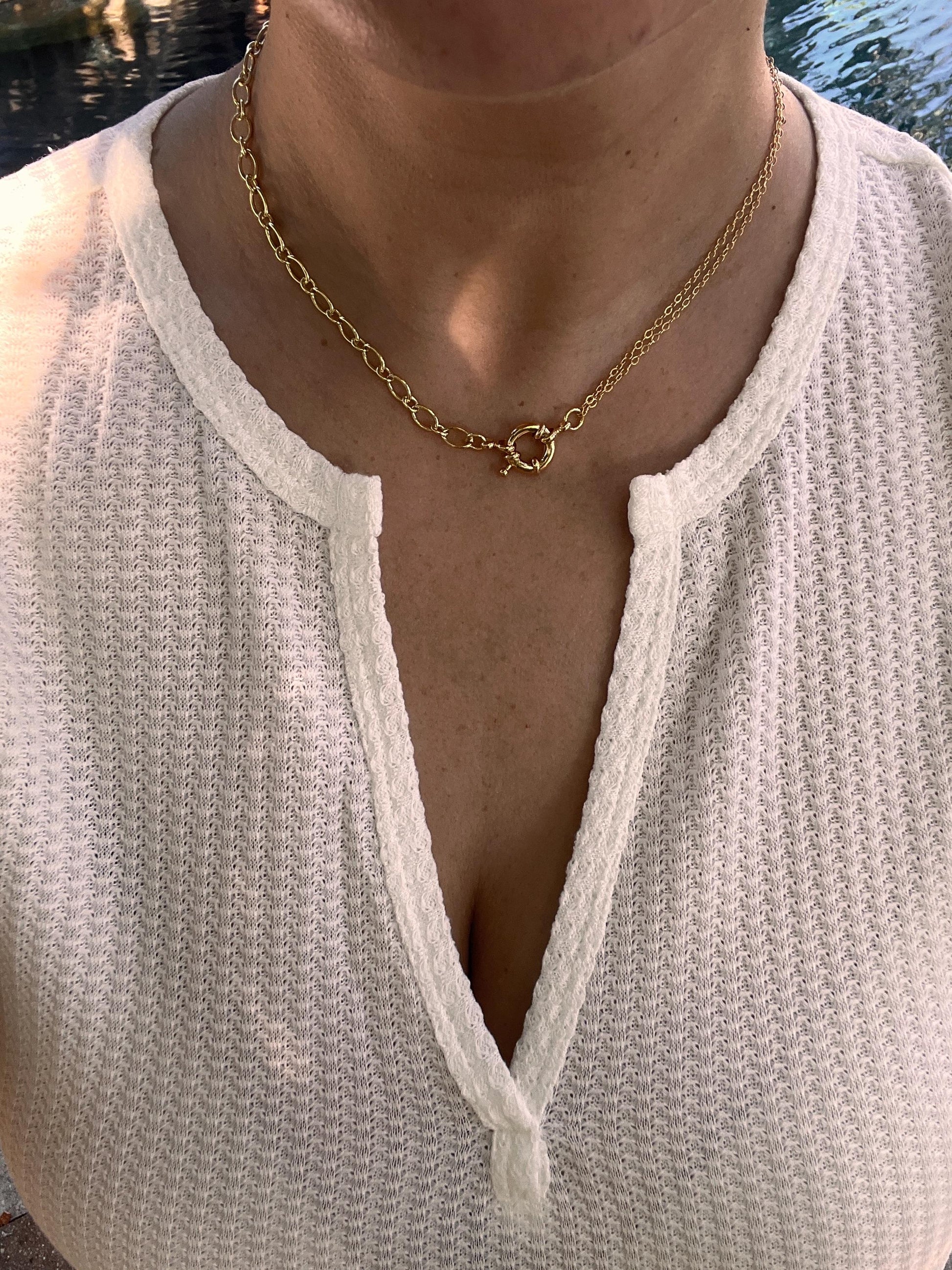 Mixed chain necklace with spring ring clasp. This necklace is 18” long and closes at the front with the spring ring clasp.