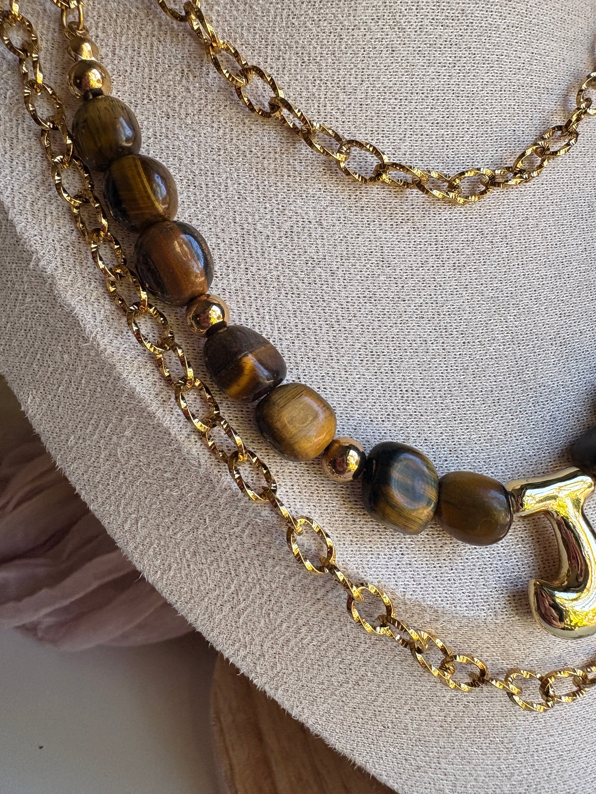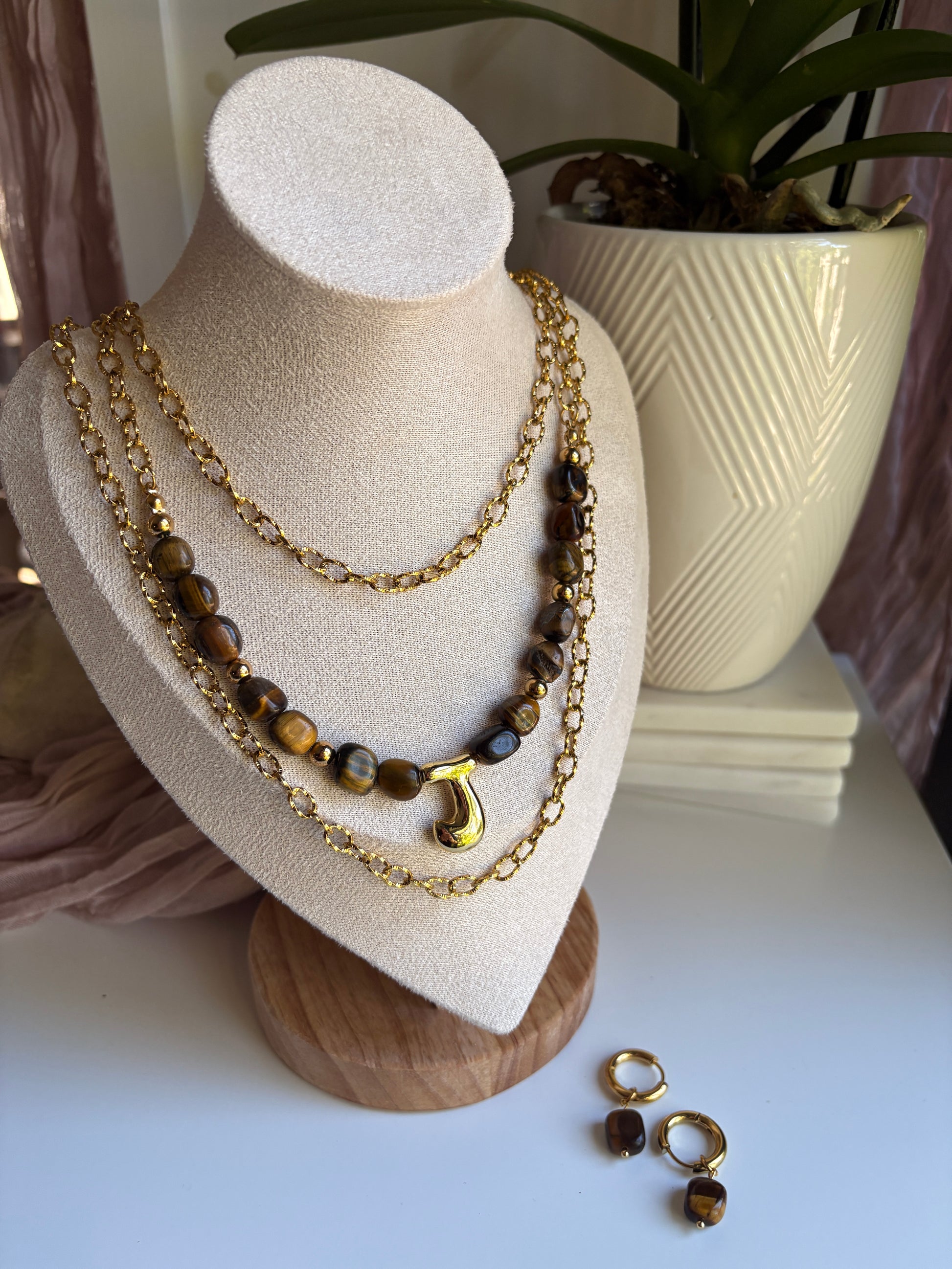 Material: Tiger eye beads, stainless steel chain, gold plated initial, stainless steel earrings